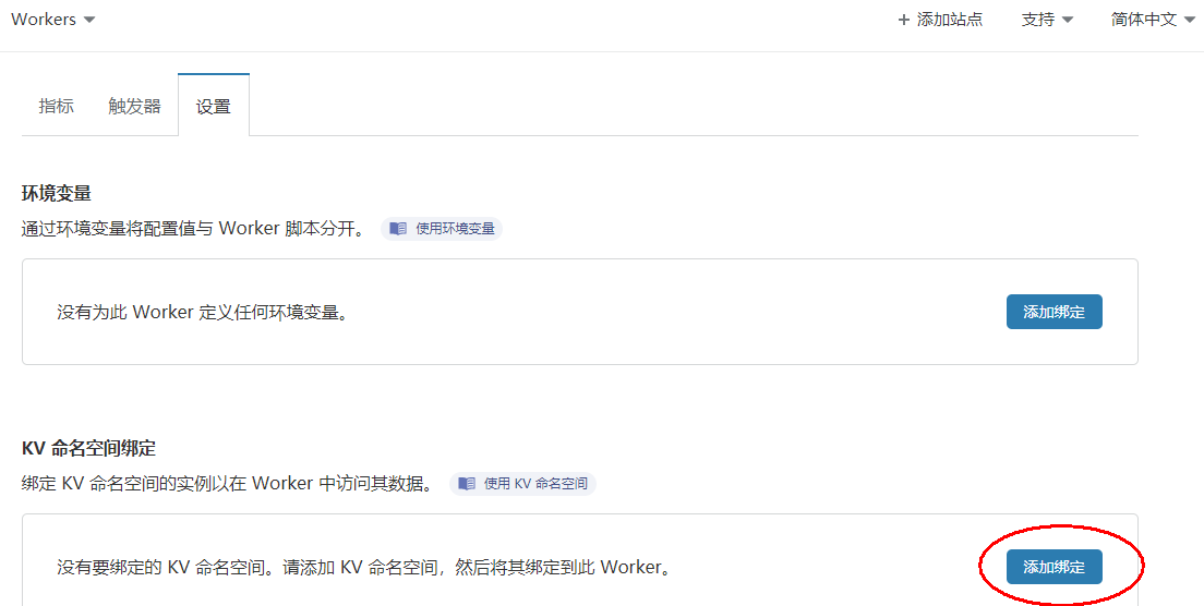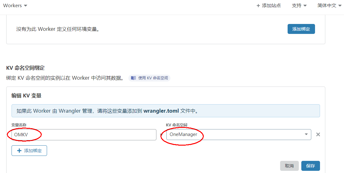 在workers设置中,KV 命名空间绑定,变量名称填入OMKV,右边下拉选择你对应的KV空间